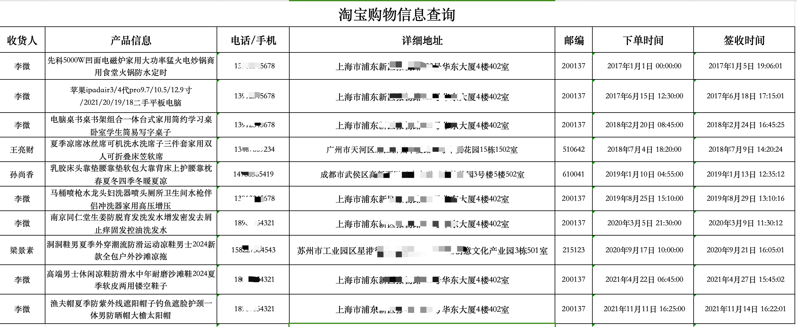 提供淘宝号或绑定的对应手机号,就可轻松查询购物历史,包括购买的商品详细信息、交易时间,详细收货信息